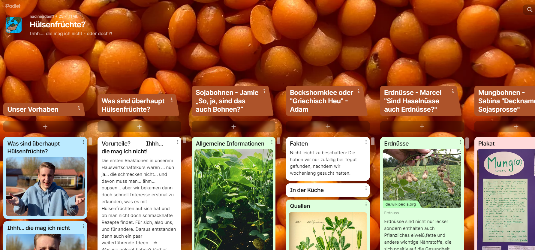 Padlet zu den Fragen: Was sind Hülsenfrüchte? Gibt es Vorurteile? Vorteile? Nachteile? Leckere Rezepte?