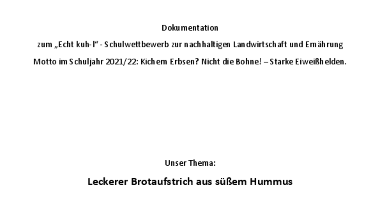Entwicklung von gesundem Hummus-Brotaufstrich als Alternative zu kalorienreichen, süßen Brotaufstrichen mit Test und Aufnahme ins Angebot der Schul- und Internatsküche
